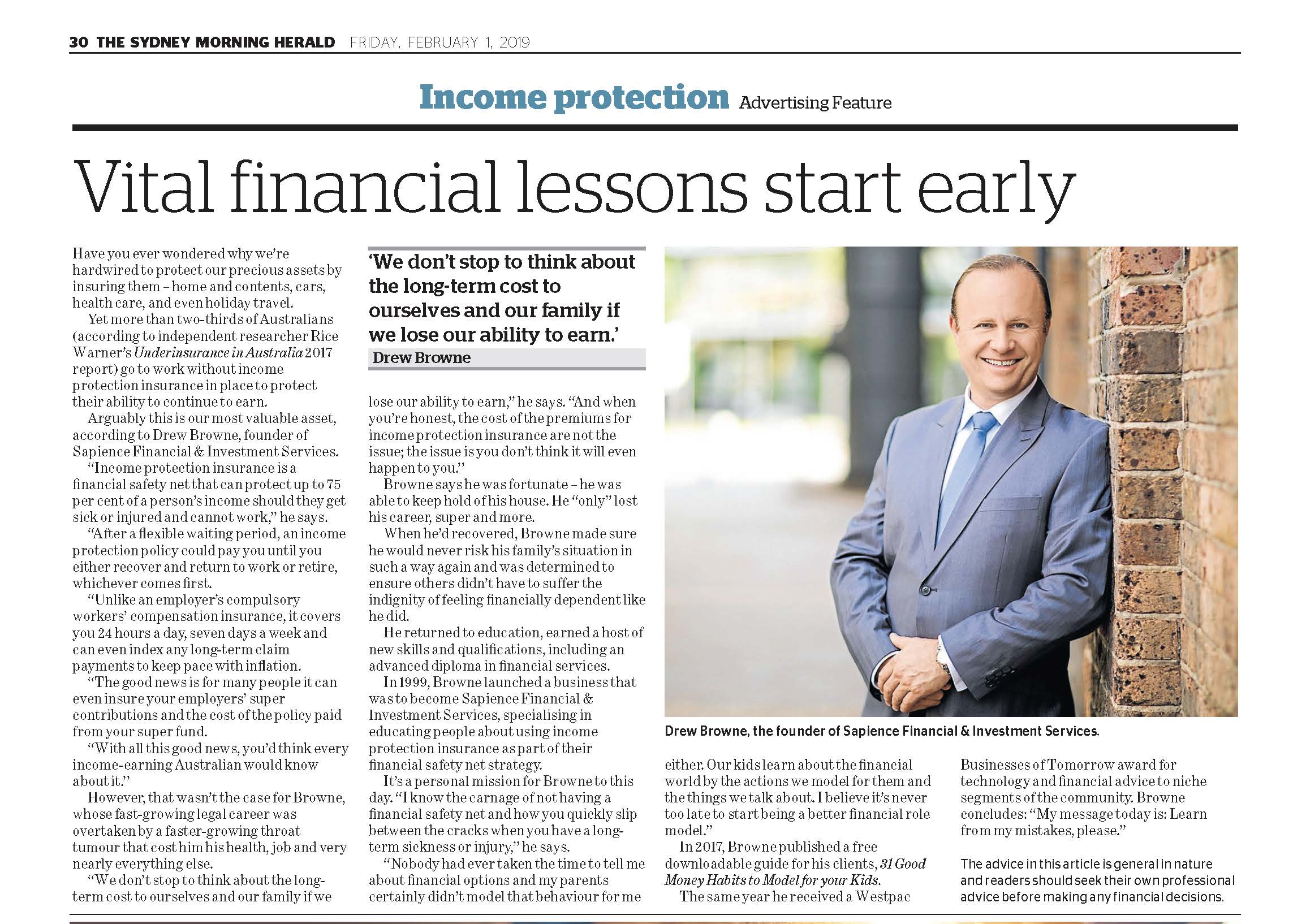 Drew Browne Director of Sapience Financial and Investment Services appeared in the Sydney Morning Herald Friday 01.02.2019 during the Back to School week, speaking about good financial behaviours to model for our kids and how we're all a role model for someone.